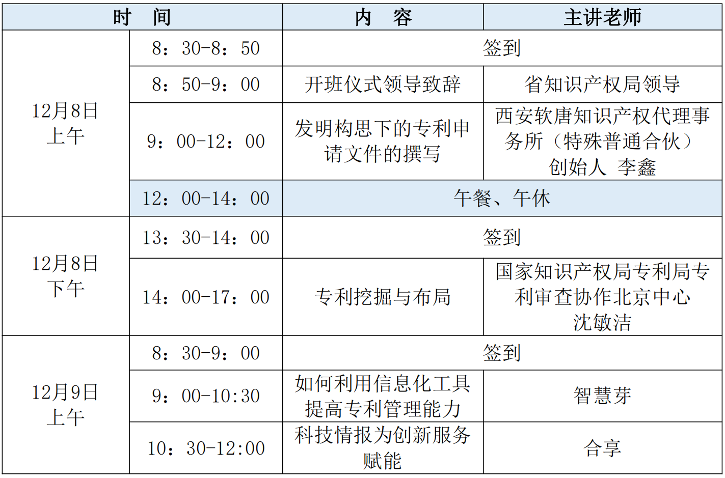 本次培训为专利代理师A类培训,共12课时,按照专利代理师参加培训的实际时间记录课时。上午下午均须签到,课时以签到表记录为准,签到严格遵守要求一人一签,不得代签。