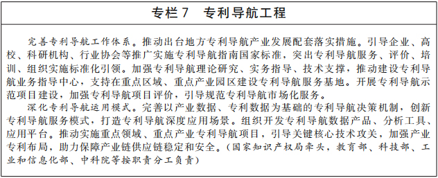 促进知识产权服务业与区域产业融合发展。聚焦重点区域、重点产业需求,优化知识产权服务业集聚区建设,引导知识产权服务链上下游优势互补、多业态协同发展。建立知识产权服务对接重点产业、重大项目工作机制,重点提供专利导航等高端服务。鼓励知识产权服务机构为创新主体提供全链条、专业化知识产权服务,支持企业创新发展和产业转型升级。(国家知识产权局牵头,工业和信息化部等按职责分工负责)
