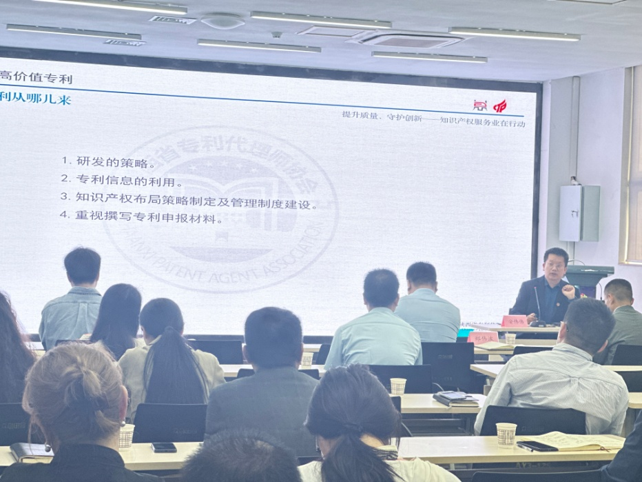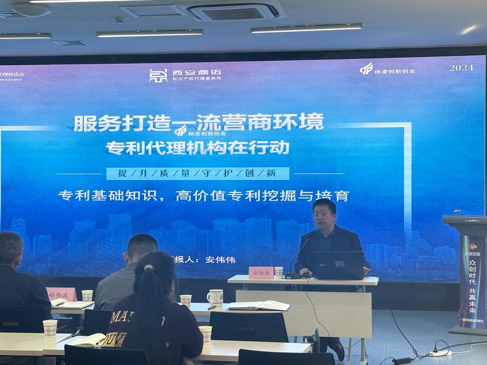 4月18日,西安鼎迈知识产权代理事务所副总经理安伟伟应邀为杨凌某园区的农业新质生产力赋能企业高质量发展研讨交流会上做了题为《专利基础知识与高价值专利挖掘培育》的专题培训。知识产权相关人员30余人参加了培训,企业总经理米强主持培训活动。