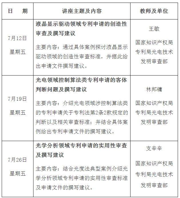 专利文献馆2024年7月公益讲座计划:“光电领域专利申请撰写与审查标准”专题 发布时间: 2024-06-28 阅读:801 讲座时间:14:00-16:00 讲座形式:网络课堂直播 咨询电话:010-62086805 网络课堂直播地址:https://cast.263live.net/COMVqu “专利文献众享(patdoc)”微信公众号发布公益讲座信息并提供专利文献服务 专利文献馆 2024年6月 分享: