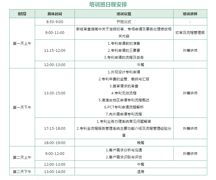 中国专利申请流程详解、PCT申请流程、向外国申请专利流程、专利全流程服务管理系统功能介绍、专利业务办理系统常见问题解答、客户沟通技巧。