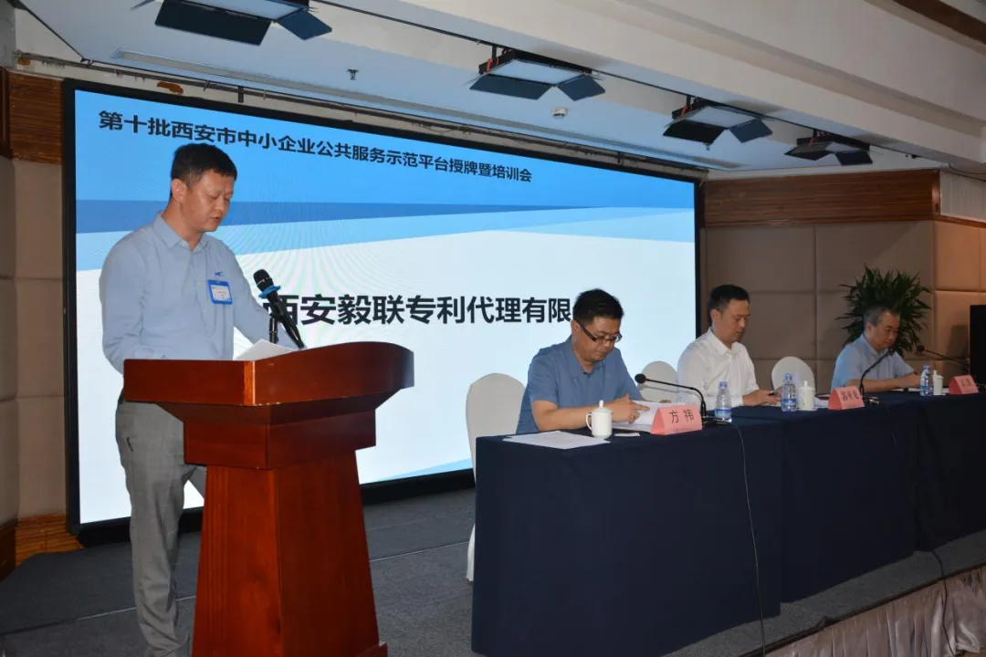 会上,西安市工业和信息化局正式发布了第十批中小企业公共服务示范平台认定文件,并为获得认定的31家西安市中小企业公共服务示范平台授牌。西安毅联专利代理有限公司凭借多年来在知识产权代理服务领域的优质高效服务质量,继2019年首次认定为西安市中小企业公共服务示范平台后,再次被成功认定。王胜利上台接受授牌,并代表优秀服务机构发言。