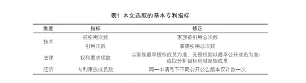 基于上述考虑,从指标对于专利的代表性、指标数据获取难易等角度出发,本文选取被引用次数、引用次数、权利要求项数和家族成员数四个指标作为基本指标,并对其进行修正,参见表 1。