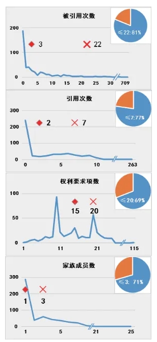 (注:菱形◇表示中位数,叉号× 表示平均数;右上角饼图中百分比表示指标值在平均数以下专利占比)