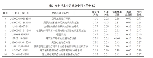排名第一的US20020193685A1和第二的US2 0020013596A1均是美国瓦里安(VARIAN)的专利,其对应家族分别被引用700余次和500余次,并在美国、加拿大、澳大利亚、欧洲、日本等进行布局,两者属于同一技术路径,代表了该申请人在放疗图像引导方向的技术方向。